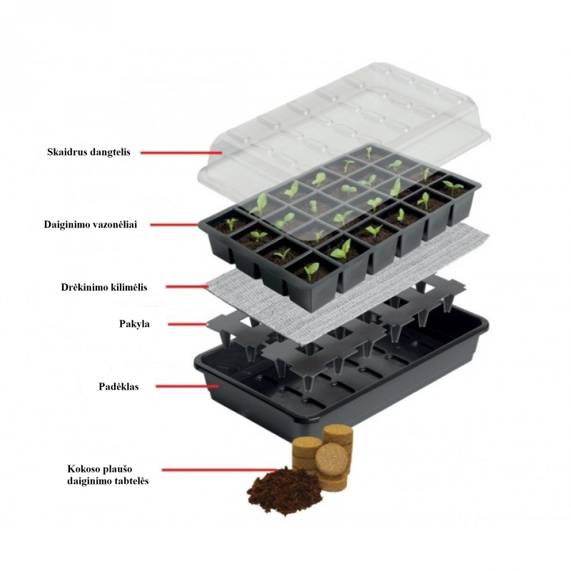 - 24 skyrelių daigyklą su kokoso plaušo daiginimo tabletės vietoj durpių