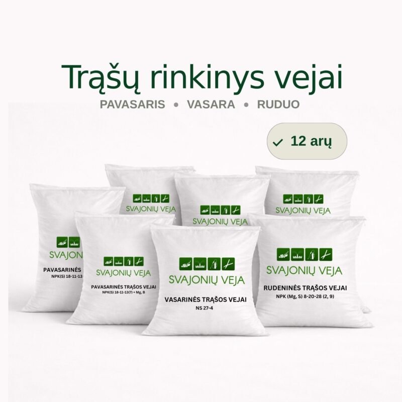 - 2 maišai po 20 kg pavasarinių trąšų, tręšimo norma 3-3,5 kg/a. Tręšiama balandžio mėnesį.